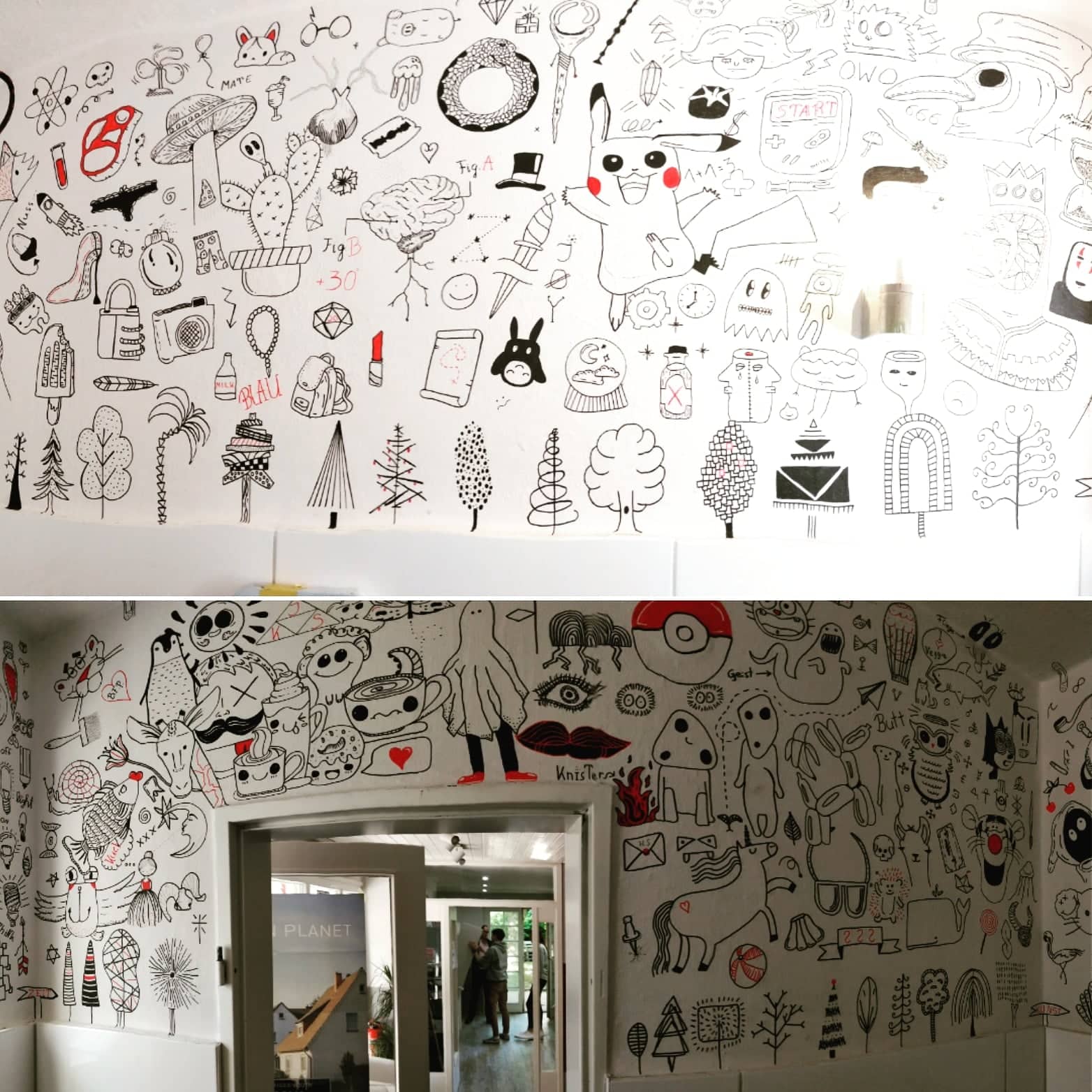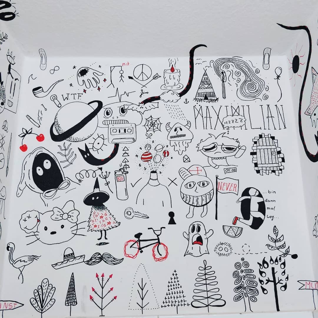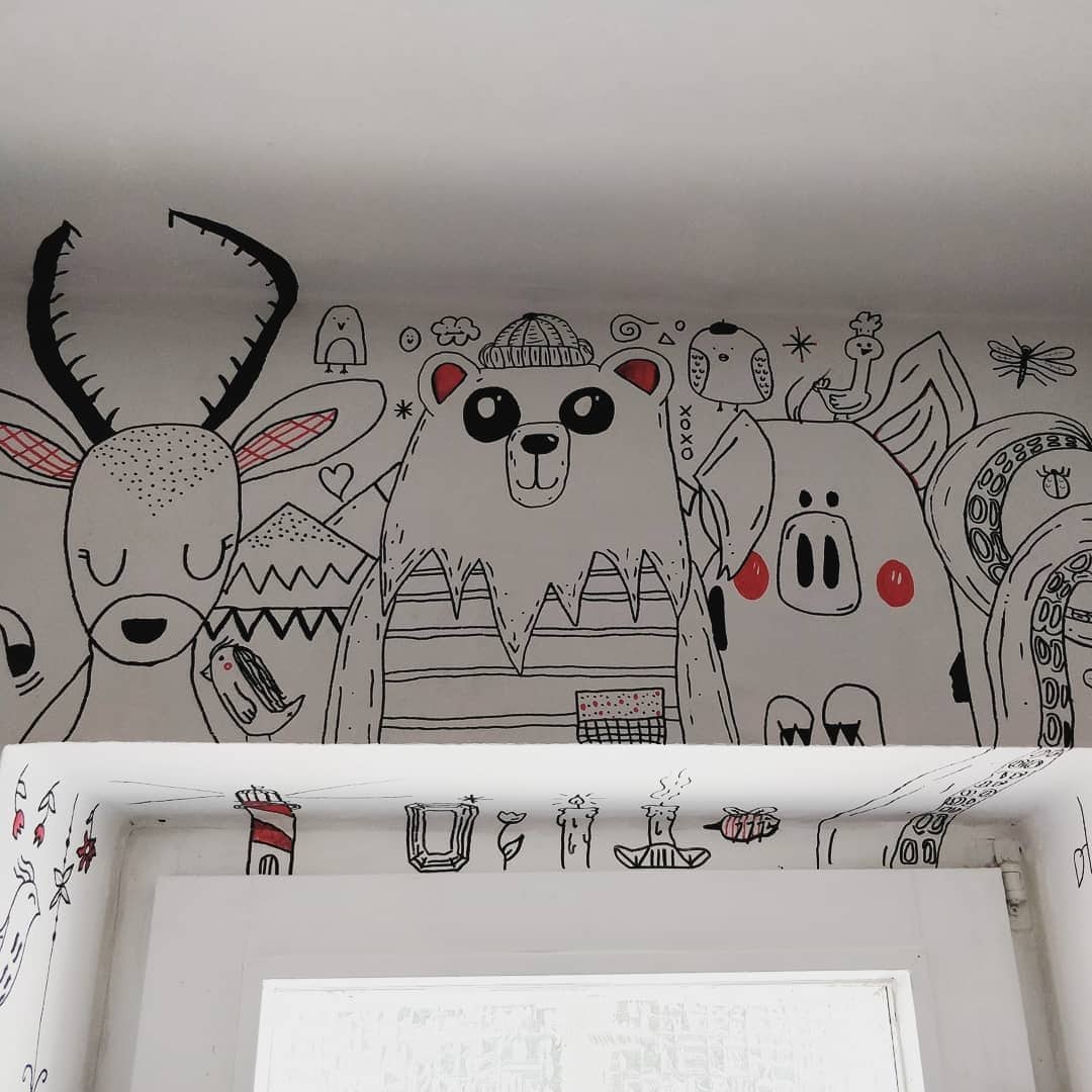 Hier habe ich den Waschraum der Jugendkunstschule Ibbebürens frei bemalen dürfen. Meine Idee war es, möglichst viele Motive zu zeichnen, damit die Schüler immer was neues zu entdecken haben und die Ausrede „Ich weiß nicht was ich malen soll“ nicht mehr zählt.